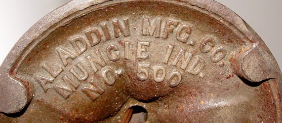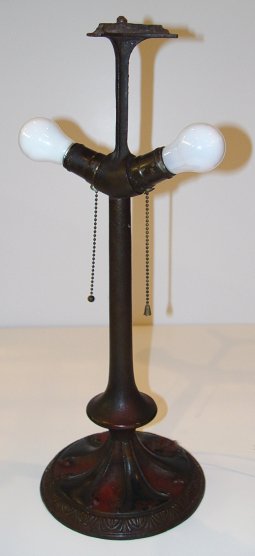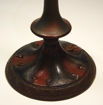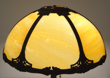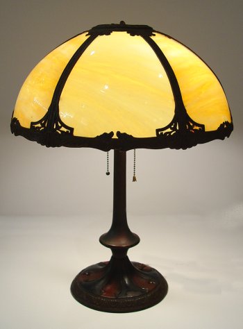 ALADDIN MFG CO CARMEL BENT SLAG GLASS TABLE LAMP: 6 panel shade, 16 1/2''dia., base with original polychrome patina, dual pull chain sockets, 21 1/2''h., marked Aladdin Mfg Co Muncie Ind #500.