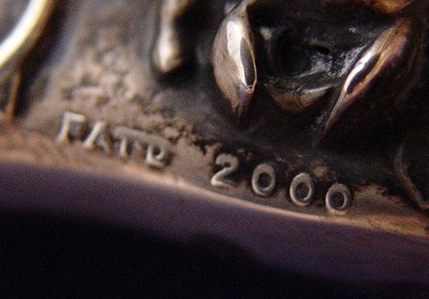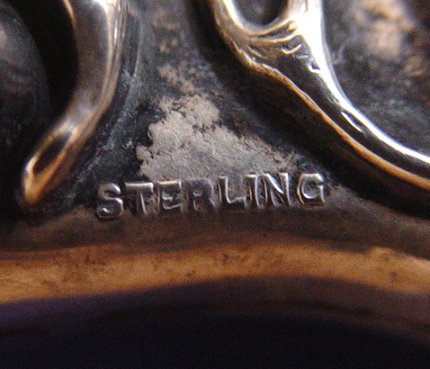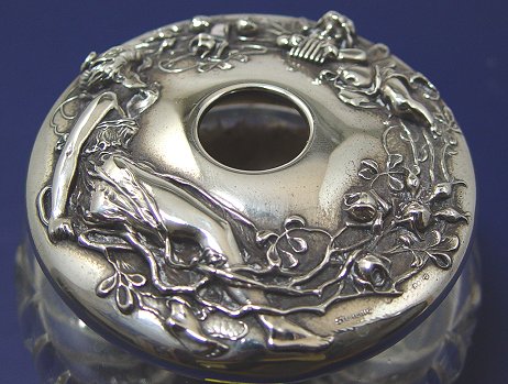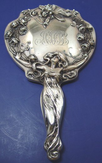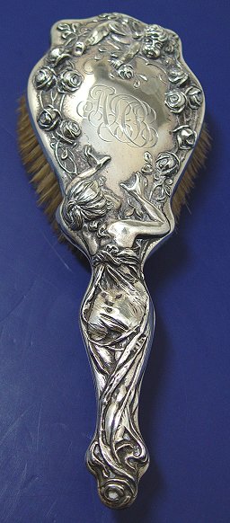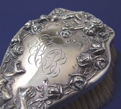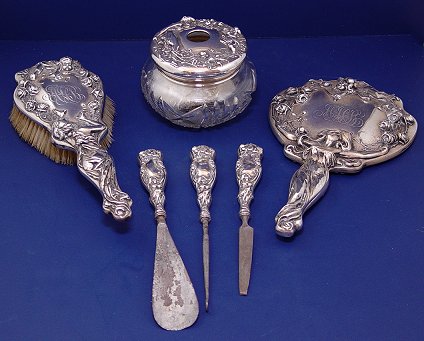 ART NOUVEAU STERLING DRESSER SET: Possibly Unger Bros, this 6 piece set includes a cut glass puff jar with puff, hair brush, 9 1/2''l, hand mirror, 6'' dia, 10''l, shoe horn, button hook, and file. Please note the file has a separation in the handle, and both the file and shoe horn show wear. Each piece is stamped ''Sterling'' and ''Pat'd 2000''. Monogrammed.