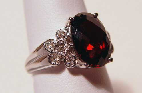 BRIOLETTE CUT 7CT GARNET RING: Sparkling large garnet mounted in 14k white gold with tiny diamonds set in shoulders, missing one, size 7, 4 grams.