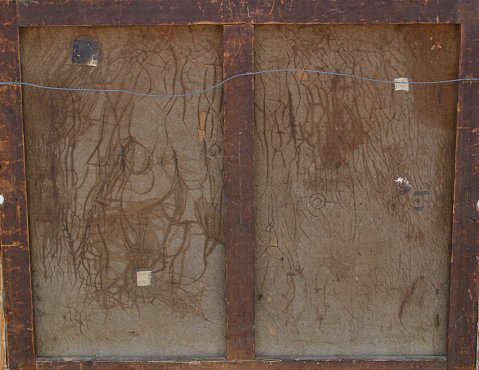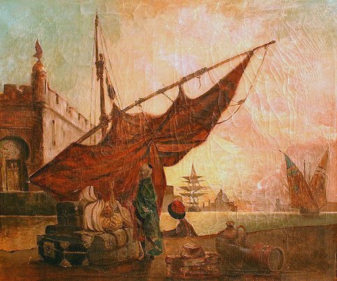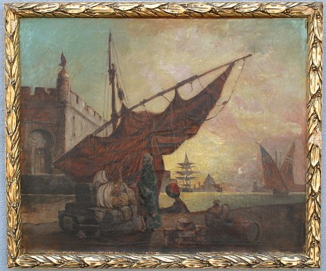 19TH CENTURY ORIENTALIST EUROPEAN PORT SCENE WITH FIGURES: O/C, 21'' x 25 3/4'', no visible signature, encased in a newer gilded leaf and berry motif frame with wear. Condition - Needs work: cleaning, possible reline, several patches visible verso, craquelure throughout.