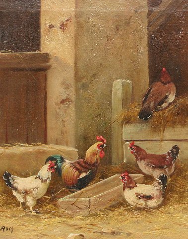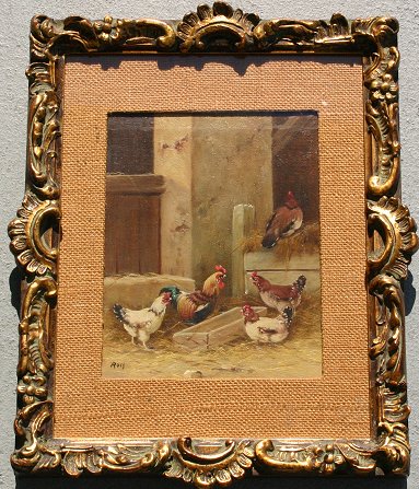BARNYARD SCENE WITH CHICKENS, O/B: Sight size 9 1/2'' x 7 1/2, signed by ''Rolf?'', encased in gilded gesso and embossed molding. Condition - Craquelure in upper margin.