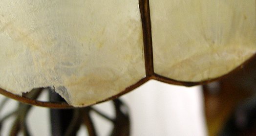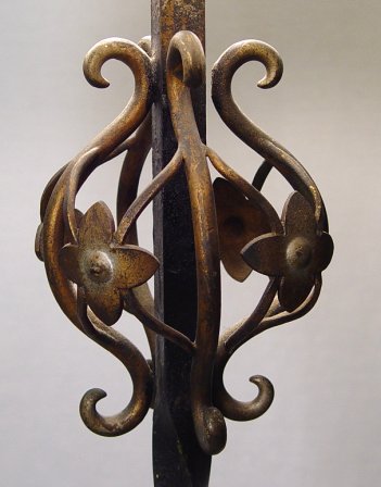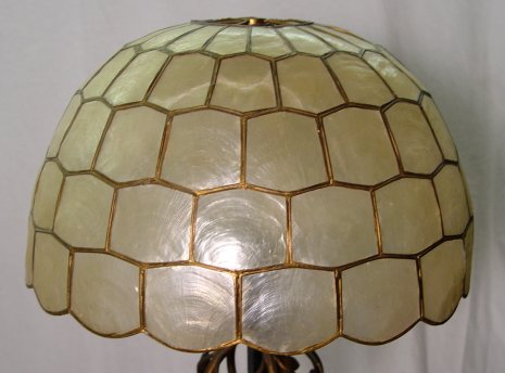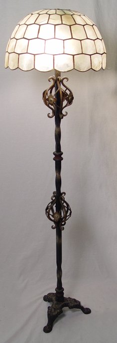 WROUGHT IRON FLOOR LAMP: Leaf and vine design on cabriole legs. 56 1/2''. Sold with the capiz shell shade.