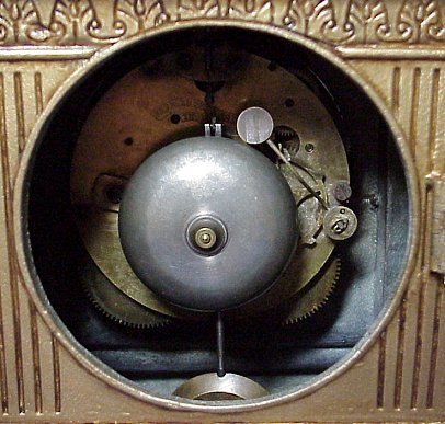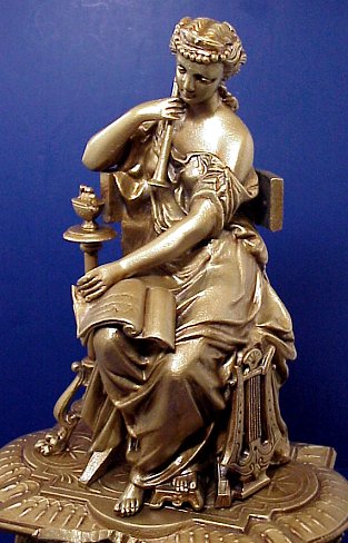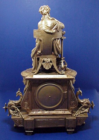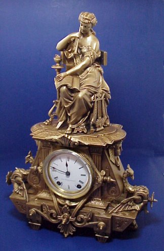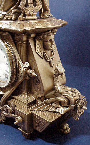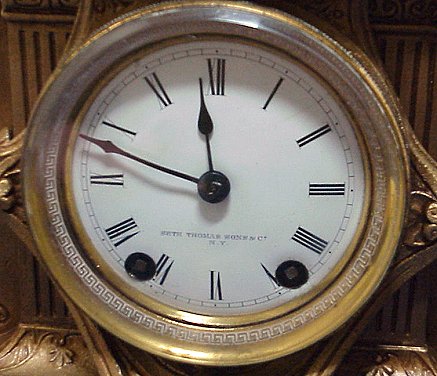 19TH C SETH THOMAS MANTLE CLOCK: Surmounted by a classic figure of a Grecian or Roman goddess. Ornately decorated with dragons and lady head masquerons. Enamel dial signed Seth Thomas Sons & Co. N.Y., beveled glass. Restored condition. 17'' x 13'' x 6 1/2''. Est. $400/500**