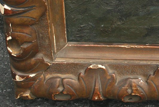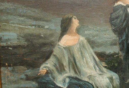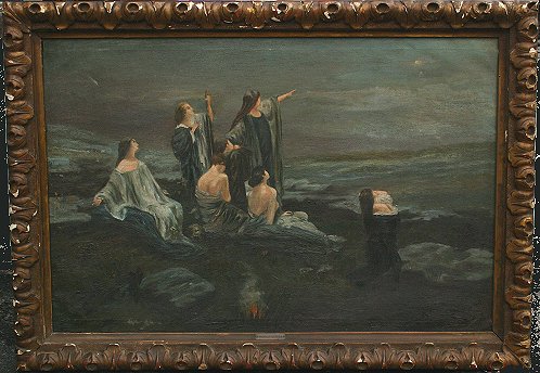 MENDLIK, Oszkar, Att., (Hungarian, 1870-1963): Female figures in a seashore landscape, O/C, 25'' x 37 1/4'', enhanced signature in lower left, marked with a name tag, encased in a period well worn gilded gesso frame in need of repair. Condition - Several scrapes throughout, several portions of paint flake loss mostly in the mid left margin and lower left corner. Needs work.