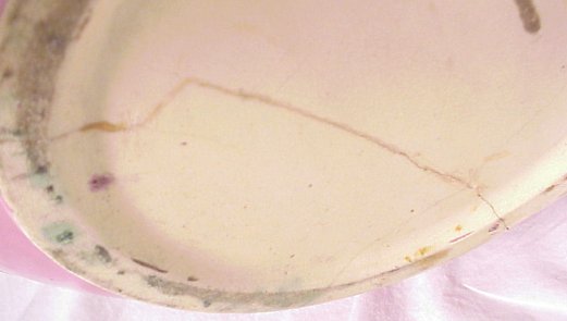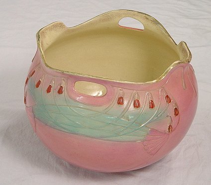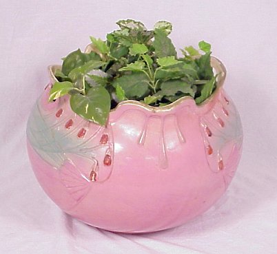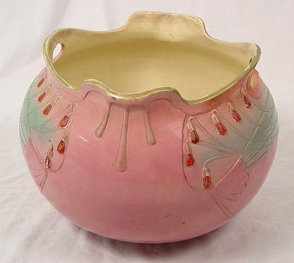 LARGE POTTERY JARDINIERE: Pink majolica body decorated with bell flowers. Pierced handles. 14'' dia, 12 1/4''h. Decorative value, cracks around base. Est. $150/200**