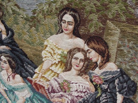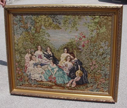 VICTORIAN NEEDLEPOINT TAPESTRY: Depicting group of antebellum ladies in full regalia in a garden landscape setting. 41 1/2'' x 50'' overall with gilt wood frame.