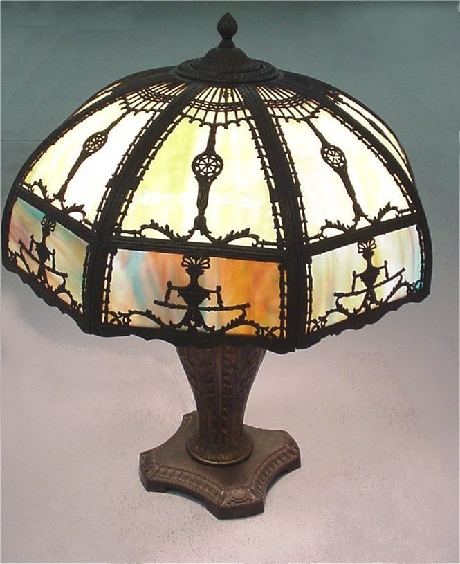 VINTAGE BENT PANEL SLAG GLASS PARLOR LAMP: Striated slag glass in shades of green and blue under metal filagree. 2 socket pull chains. 20''dia., 24'' h.