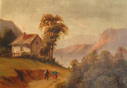 LATE 19TH C O/C WATERSIDE SCENE WITH FIGURES TRAVELING DOWN A PATH: 10'' x 14'', encased in a period gilded frame with gold overpaint and wear throughout, no visible signature. Condition - Needs cleaning.