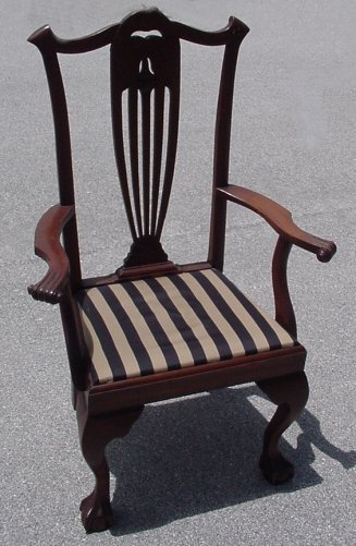 PAIR OF CHIPPENDALE STYLE MAHOGANY ARM CHAIRS: Pierced splats, shaped top rail, scrolled arm holds, ball and claw feet. Approx. 44''h, x 28'' x 17''.