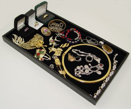 LOT OF COSTUME AND STERLING JEWELRY: To include, Brighton sterling charm bracelets and rings, approx. 7 grams of gold to include a man's 14k wedding band and lady's 10k amethyst ring, signed costume by Bogoff, Jane and Sarah Coventry. Sold as a lot.