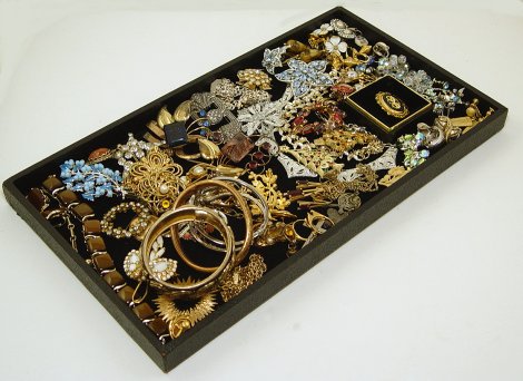 LARGE LOT OF ESTATE COSTUME JEWELRY: A variety of costume jewelry to include: Antique gold filled gem bracelet, rings and earrings; Sterling charms and bracelets, Italian mosaic brooch, Vintage rhinestone brooch ensemble, bone earrings. Plus lots of signed pieces such as Coro, Hobe, Sarah Coventry, Trifari, Kramer, Monet and B+N. All of this jewelry will be sold together as a lot.