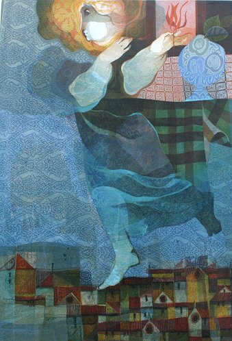 ALVAR, Sunol, (Spanish, 1935-): Woman floating over a village, surreal scene, Color Lithograph, sight size 30'' x 21'', pencil signed lower right, numbered ''37/285'' lower left, encased in contemporary mat and frame, frame has some wear, but good overall, ready to hang.