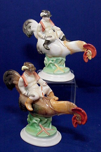 PAIR OF HEREND HUNGARIAN PORCELAIN FIGURES OF BOY ON ROOSTER: 5 1/2''h. 7''l.