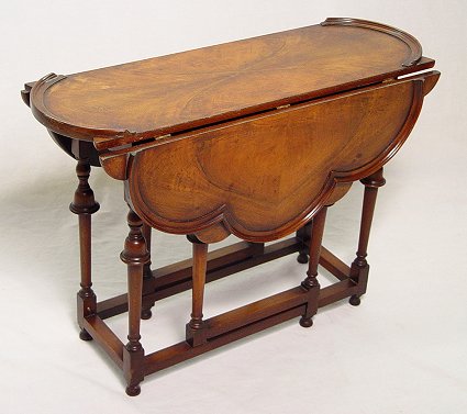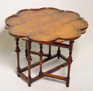 FINE 20TH C DIMINUTIVE DROP LEAF GATELEG TABLE: Highly grained and scalloped veneer top, swing leg table. 20''h, 28'' dia. when leaves are opened.