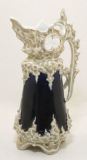 WHEELING POTTERY OHIO VALLEY CHINA CO. PORCELAIN EWER: Elaborate form cobalt glaze porcelain pitcher. Hallmark O.V underlined. 10 1/4''h.