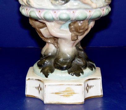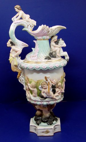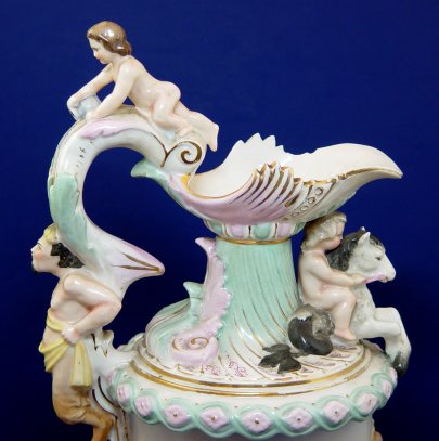 FIGURAL PORCELAIN EWER DECORATED WITH MYTHICAL CHARACTERS: Mermaids at the base, putti frieze around the base, a satyr on the handle. Unidentified maker. 16''h. No chips or cracks.