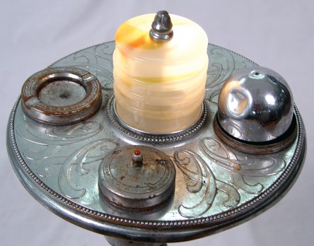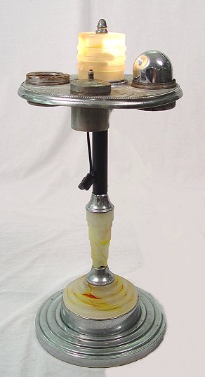 ELECTRIC ART DECO SMOKE STAND: Slag glass and chromed metal with lighter, light, cigarette box.