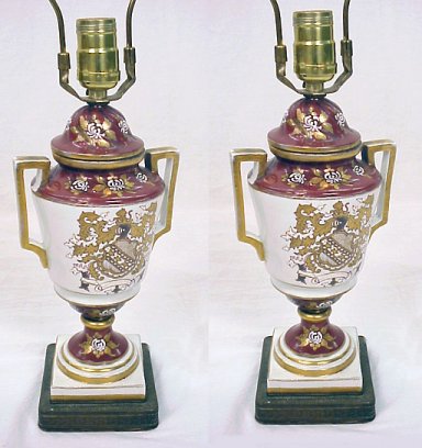 PAIR OF ARMORIAL FRENCH PORCELAIN LAMPS attrib. to SEVRES: Covered urns mounted as lamps. Iron red, white and gold coloration. Porcelain is 11''h, overall the lamps are 25''h. Please note repair to handle.
