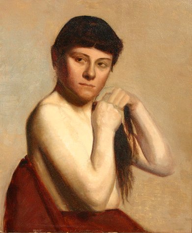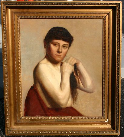 BALLE, Otto Petersen, (Danish, 1865-1915): Portrait of young girl braiding her hair, O/B, 22 1/4'' x 18 1/2'', signed faintly lower left, name plate affixed, encased in a gilded molding with wear and missing gesso, 29 1/4 x 25 1/4. Condition - Restored portions detectable by black light include forehead, left side of face, left arm, scattered minimal spots throughout.
