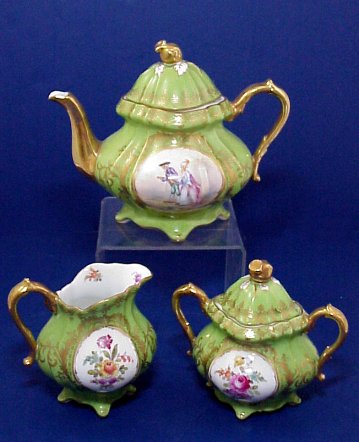 CHARLES AHRENFELT & SON TEA SET: Teapot, cream pitcher and covered sugar decorated in floral sprays on one side, courting scene on the other. Ahrenfelt was a French Limoges company and also an New York City importer of fine porcelain. Please note chip on the inside of the teapot lid, otherwise condition is very good.
