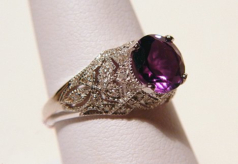 REGAL FILIGREE 1.5ct AMETHYST RING: 14k white gold cast filigree mount pave set with diamonds, approx. .23ctw, holding a vibrant purple amethyst of 1.5ct, marked 14k, size 6.5, approx. 3 grams.