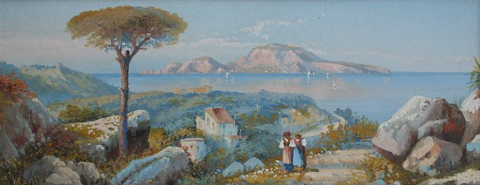 ITALIAN GOUACHE LANDSCAPE OF THE BAY OF NAPLES: Titled verso ''Capri De Massa'', 5'' x 13'', no signature visible.