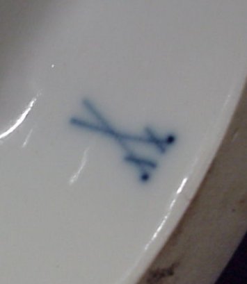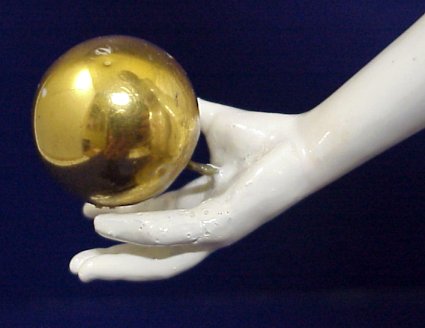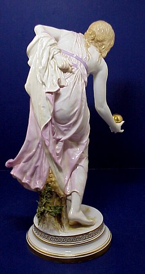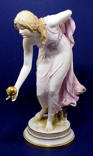 MEISSEN ART NOUVEAU FIGURE OF WOMAN WITH BALL: Fabulous model of a semi-nude woman tossing a gold ball. Beautiful facial features and flowing gown. Please note restoration has been done on her hand with the ball. Blue cross swords mark under glaze. 14 1/4''h., the round base is 5 7/8'' dia.