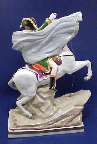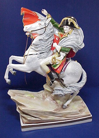 SITZENDORF FINE PORCELAIN FIGURE OF NAPOLEON: Very large porcelain model of Napoleon on his horse, crossing the Alps. Approx. 15 3/4''h. x 12''l. x 6''w. Crown and sword mark, Ca. 1902-1972.