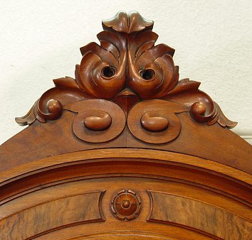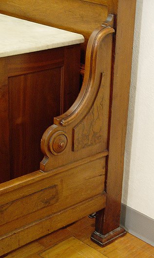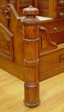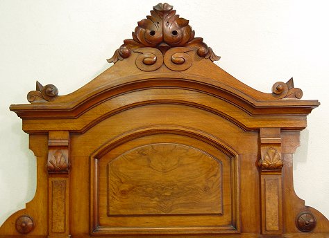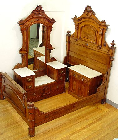 VICTORIAN RENAISSANCE REVIVAL BEDROOM SUITE: Walnut with white marble top. Set includes a magnificent 7'3'' high bed with original rails, a marble top drop center dresser with mirror, also 7'3''h, 49''w. and a marble top washstand, 29''h, x 30'' x 16''.