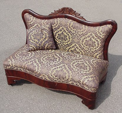 DIMINUTIVE EMPIRE PERIOD SLIPPER SOFA: Flame grain mahogany framed settee with floral carving at the crest, serpentine front, on casters. 45''l x 21'' x 15''seat height, 32 1/2'' overall height.