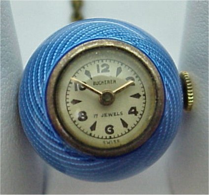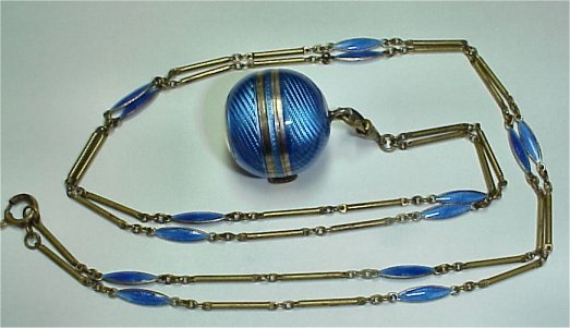 BUCHERER GUILLOCHE' ENAMEL PENDANT WATCH: Beautiful swirling blue guilloche enamel ball encasing a 17 jewel Swiss movement by Bucherer, inside case marked C.Bucherer Swiss 925 duck in box and 620 S.F., not currently keeping time. Suspended on a matching enamel link chain, 30''l.