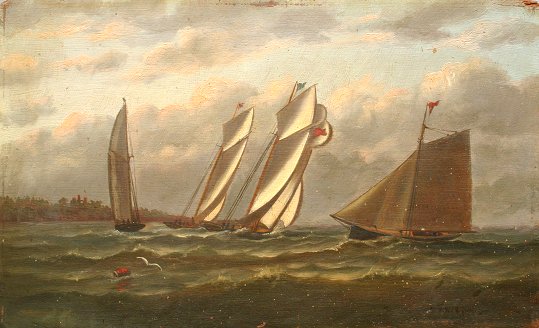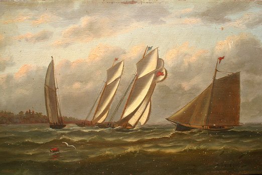 STOWE, E., (British, 19th C):, ''Yachting off the Isle of Wight'', O/Chamfered Wood Panel, 11'' x 18'', unframed, over-painted signature lower right, signed, titled and dated ''77'' verso. Condition - Paint loss due to frame rubbing in the margins, partial wood loss in upper right corner, minor craquelure and white paint over-spray mainly in the right half of the painting, needs cleaning, several dents.