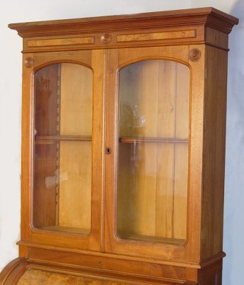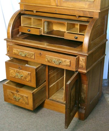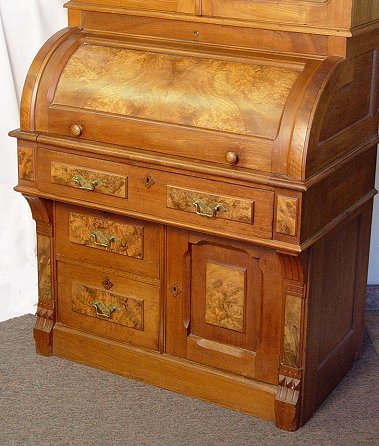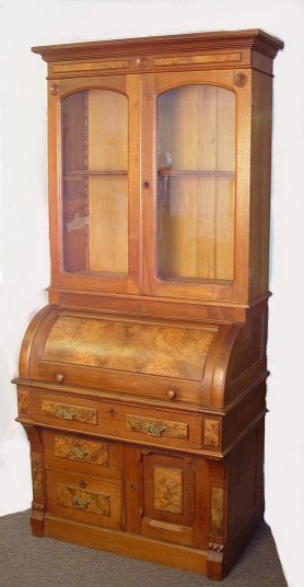 VICTORIAN WALNUT CYLINDER ROLL BOOKCASE SECRETARY: 2 sections with upper having locking glass front doors, adjustable shelves. The lower section is the locking cylinder roll top desk with interior cubicles over drawers with burled walnut panels. 81''h, 36''w x 22''.