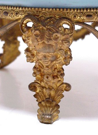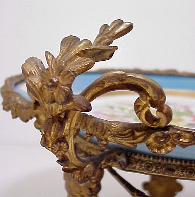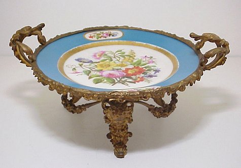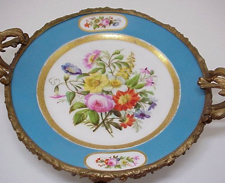 SEVRES HAND PAINTED PLATE IN GILT METAL STAND: Floral decorated French porcelain in ornate metal mount legs, rim, and handle. 10'' dia., 4 1/2''h, 6''h. overall.