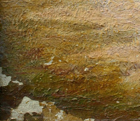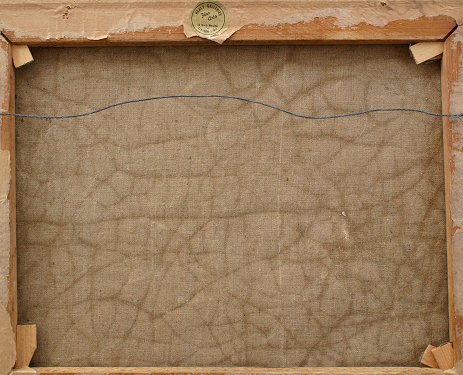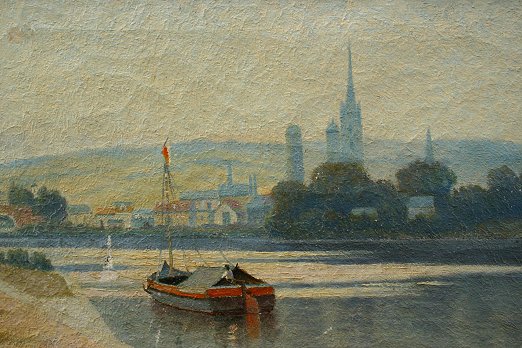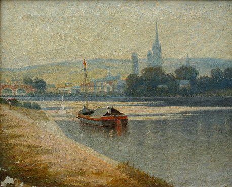 VIEW FROM THE RIVER PATH: Depicts figure traveling along path with vessel and in background is village and bridge, O/C, 16'' x 20 1/2'', circa 1930, of exceptional quality, heavy impasto. There is a label affixed verso from the Healy Galleries in Clayton, Missouri. Condition - needs cleaning, numerous sporadic paint fleck loss most notably in the lower left corner with major paint chips missing, several scrapes throughout, 2'' scrape with eraser head size puncture to the left of the boat.