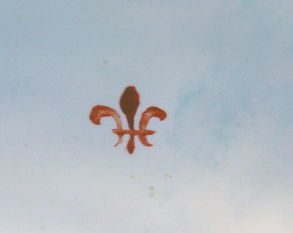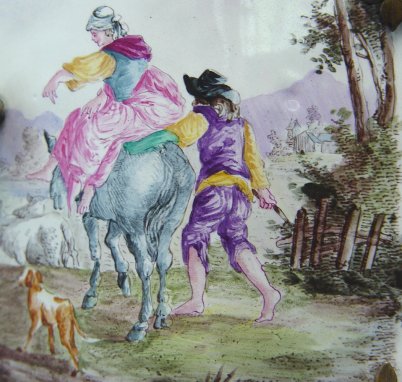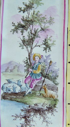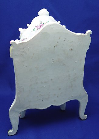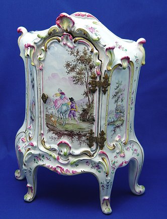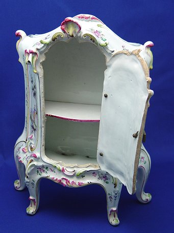 19th C FRENCH FAIENCE MINIATURE CABINET: Hand painted faience modeled after an armoire. Scenic panels, enhanced with sprays of flowers. Bombay front with single door on brass hinges. Single shelf interior. Hallmarked with a red fleur de lis. 14 1/4''h., 10 1/4''w. overall.