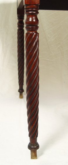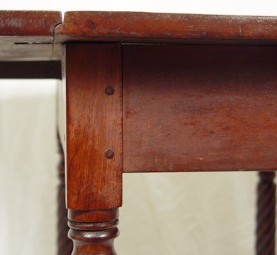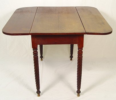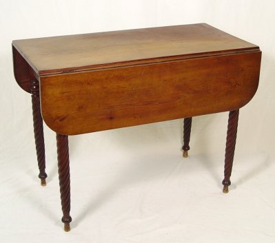 19TH C MAHOGANY DROP LEAF TABLE: Spiral carved legs, 28 1/4''h., x 38''. 20''w, with leaves down. 40'' with leaves open.