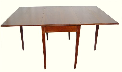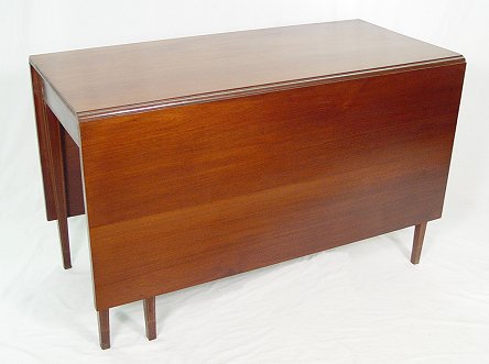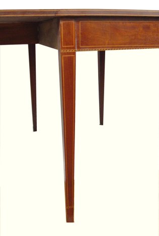STRING INLAY SOLID WALNUT HEPPLEWHITE STYLE DROP LEAF TABLE: Swing legs with a generous 17'' chair space at the ends. Expanded the table is 29 1/2''h. x 48''x 66''l. Early to mid 12th C.