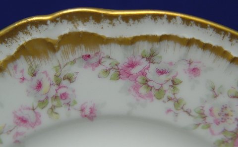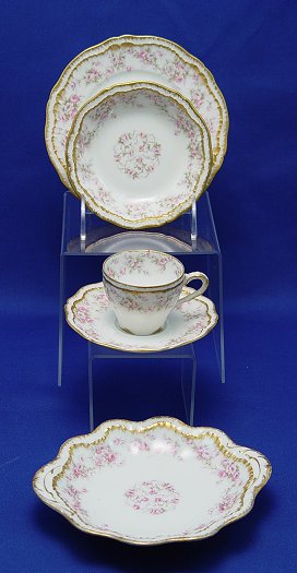 THEODORE HAVILAND FRENCH LIMOGES DESSERT SET: 34 pieces to include 11 plates, 6 1/2'' dia. 11 dessert bowls, 5'' dia., 12 demi-tasse cups and saucers, and a bon bon dish. Pink floral decoration on white china with gilt accents. Ca. early 20th C.