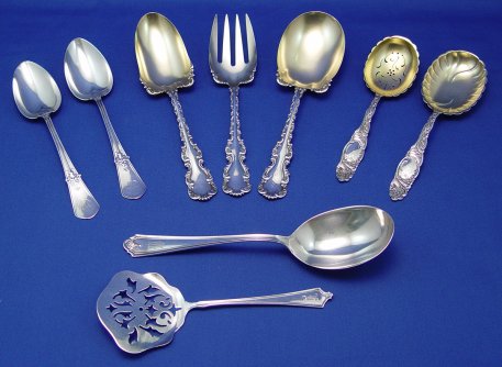 GORHAM, WHITING, TOWLE, WATSON STERLING SERVING PIECES: Two Towle ''Princess'' serving spoons with vermeil bowls, 8''l, engraved and dated 1893. 2 Whiting ''Louis XV'' spoons and forks, 9''l. Two Gorham serving spoons in an unidentified 19th C pattern. Nine pieces total sold as alot.