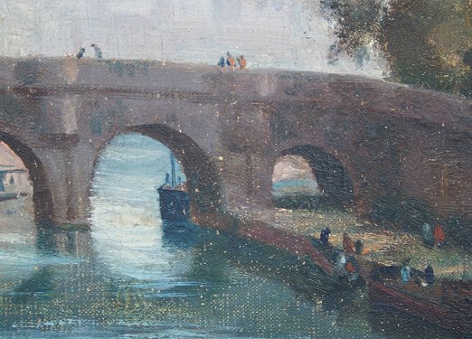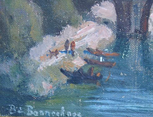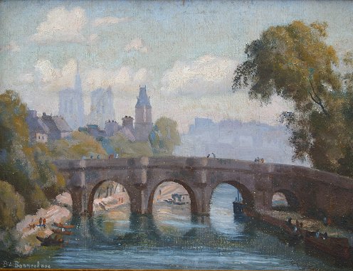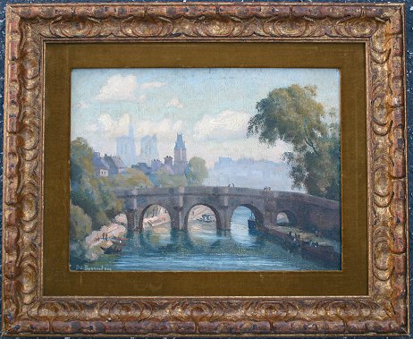 BONNECHOSE, Bertrand De (French, 20th C): View from the city from the river, O/C, 10 3/4'' x 13 3/4'', signed lower left, encased in a fine gilt carved molding with wear and missing gilt. Condition - Needs cleaning, pen head size flecks of paint loss in lower portion, no visible repairs.