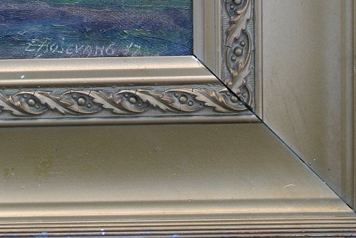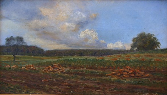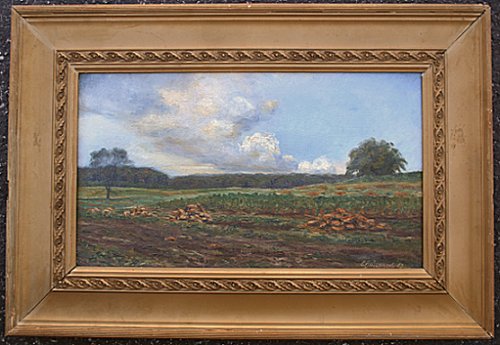 BOSEVANG, Carl, (European, 20th C): Country field, O/C, 10 1/2'' x 17 1/2'', signed lower right, titled illegibly verso and dated 1917 in pencil on the stretcher, encased in a worn frame of the period with wear and repair, 16 3/4'' x 24 1/4''. Condition - Several small areas of paint fleck, needs cleaning.