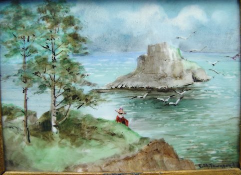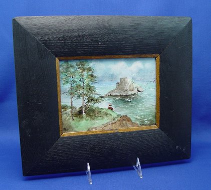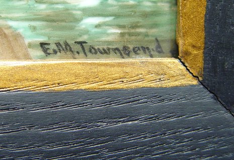 HAND PAINTED FRENCH LIMOGES PLAQUE: Coastal landscape, artist signed E.M. Townsend. In a Arts & Crafts oak frame. Image size 5'' x 7''. Plaque is backstamped with the 1892-1907 green mark for Tresseman & Vogt. 11'' x 13'' overall.