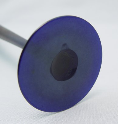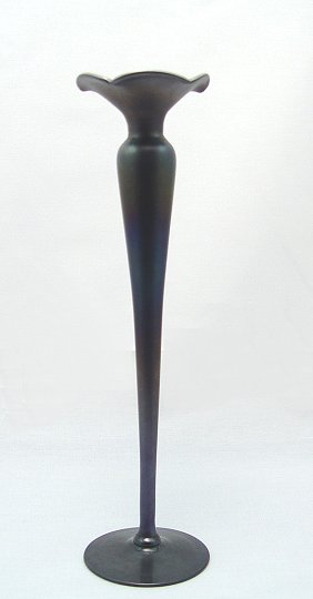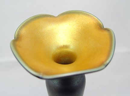 QUEZAL ART GLASS VASE: Early Quezal signature. Iridised cobalt with dramatic gold interior. Approx. 11''h., the base is 3'' dia. Excellent condition.