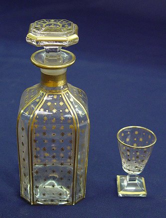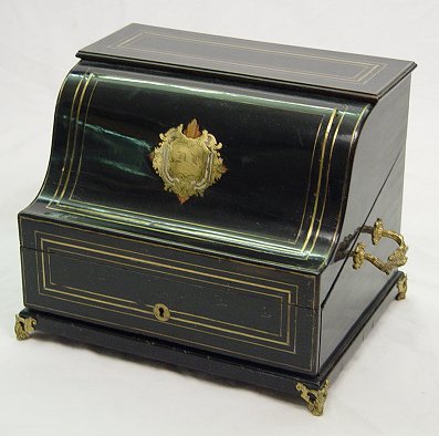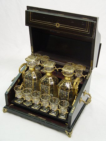 NAPOLEON III BOULE INLAY TANTALUS AND GLASSWARE: Boule inlay serpentine box. Interior fitted with removable tray. Three decanters and 10 gilt decorated cordials. The tantalus is made to hold 18 cordials. Ormolu handles and feet. 11''h. x 13 1/2'' x 10 1/4''. The decanters are 7 3/4''h.