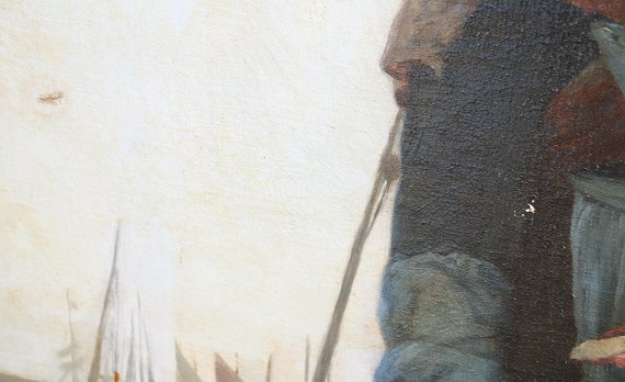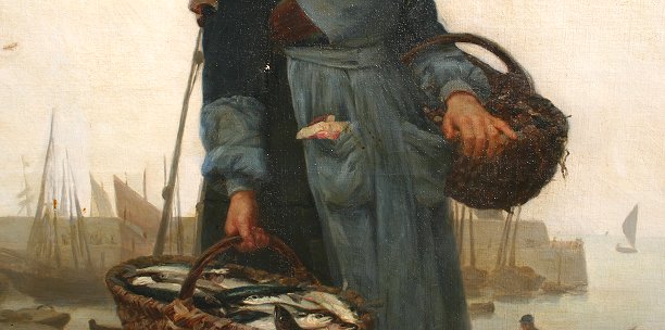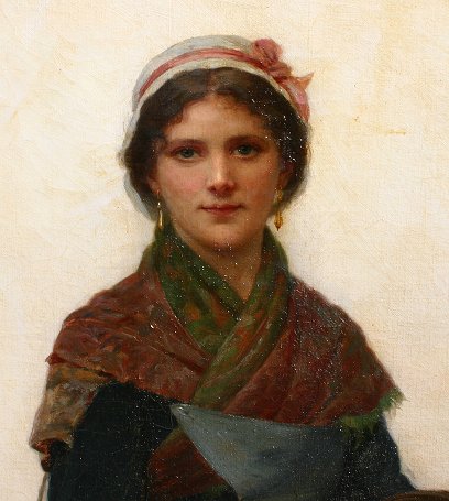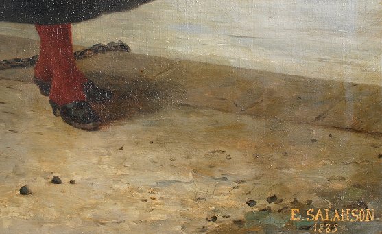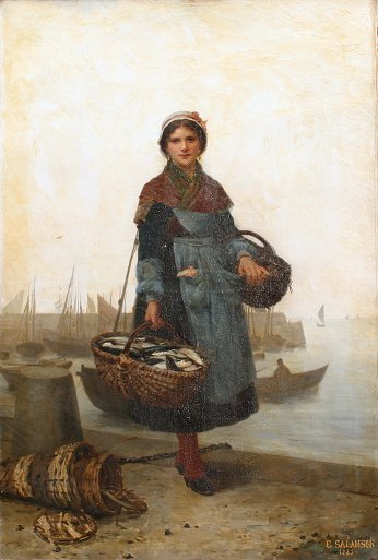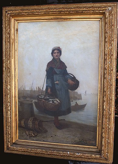 SALANSON, Eugenie Marie, (French. 1864-1892): ''The Days Catch'', O/C, 45 1/2'' x 30 3/4'', signed lower right dated 1885, encased in superior museum quality heavy gilt carved gesso molding period frame, measures 57'' x 42 1/2'', does need a little bit of touching up with some missing gesso in spots but certainly worth the effort. Condition - Needs cleaning, patch visible verso with repair visible in the front middle margin, craquelure throughout, some scattered specks of paint fleck. Est. $15000/25000**