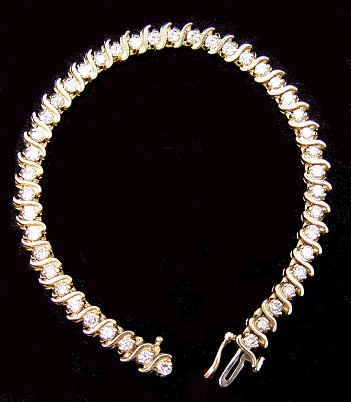 LOVELY DIAMOND TENNIS BRACELET: Lady's S style straight line tennis bracelet of 14k yellow gold with approx. 3ctw of full cut round brilliant diamonds, purported I color and clarity, 7''l. With 1994 Replacement Appraised Value of $3250.