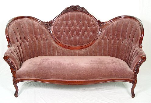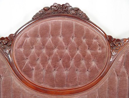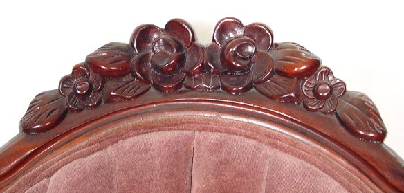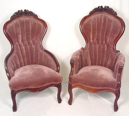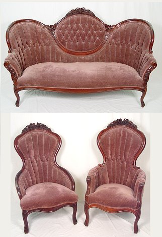 3 PIECE VICTORIAN PARLOR SUITE: Luscious plum crushed velvet on mahogany. Tufted medallion back sofa with rose carved crest, 43''h., 68''l. Sold with the matching lady and gentleman's chair.