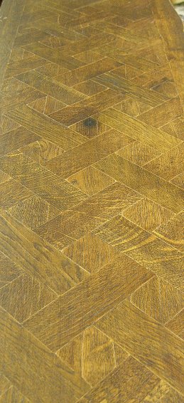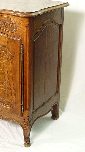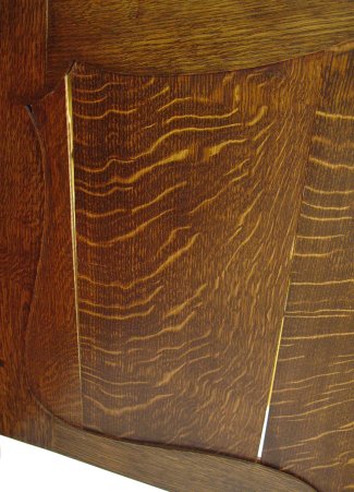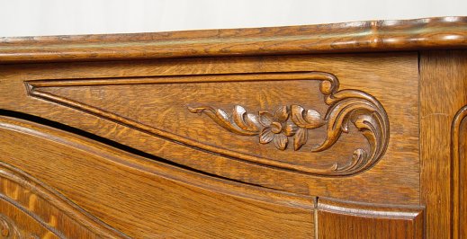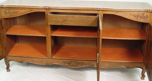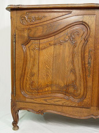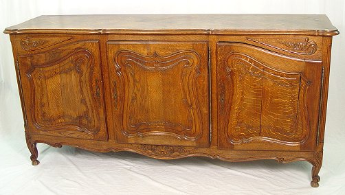 19TH C QUARTER SAWN OAK COUNTRY FRENCH BUFFET: Parquetry top over a triple door front cabinet. Interior has shelves, the mid section also has a drawer. Shaped top. Carvings trace the lines of the doors. 81''w. x 39 1/2''h. x 21''d.