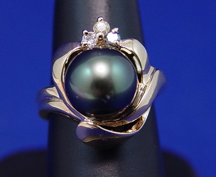 10MM TAHITIAN PEARL RING: This prestigious ring features a large 10.75mm Tahitian pearl, highly lustrous with few blemishes and a stunning dark base color with intense green overtones, accented by a mixture of fancy color diamonds including yellow, teal and silver, set in 14kt yellow gold with swirls cradling the pearl, approx. 8.3 grams, size 7.5. Retails for $1867.00. Est. $500/800**